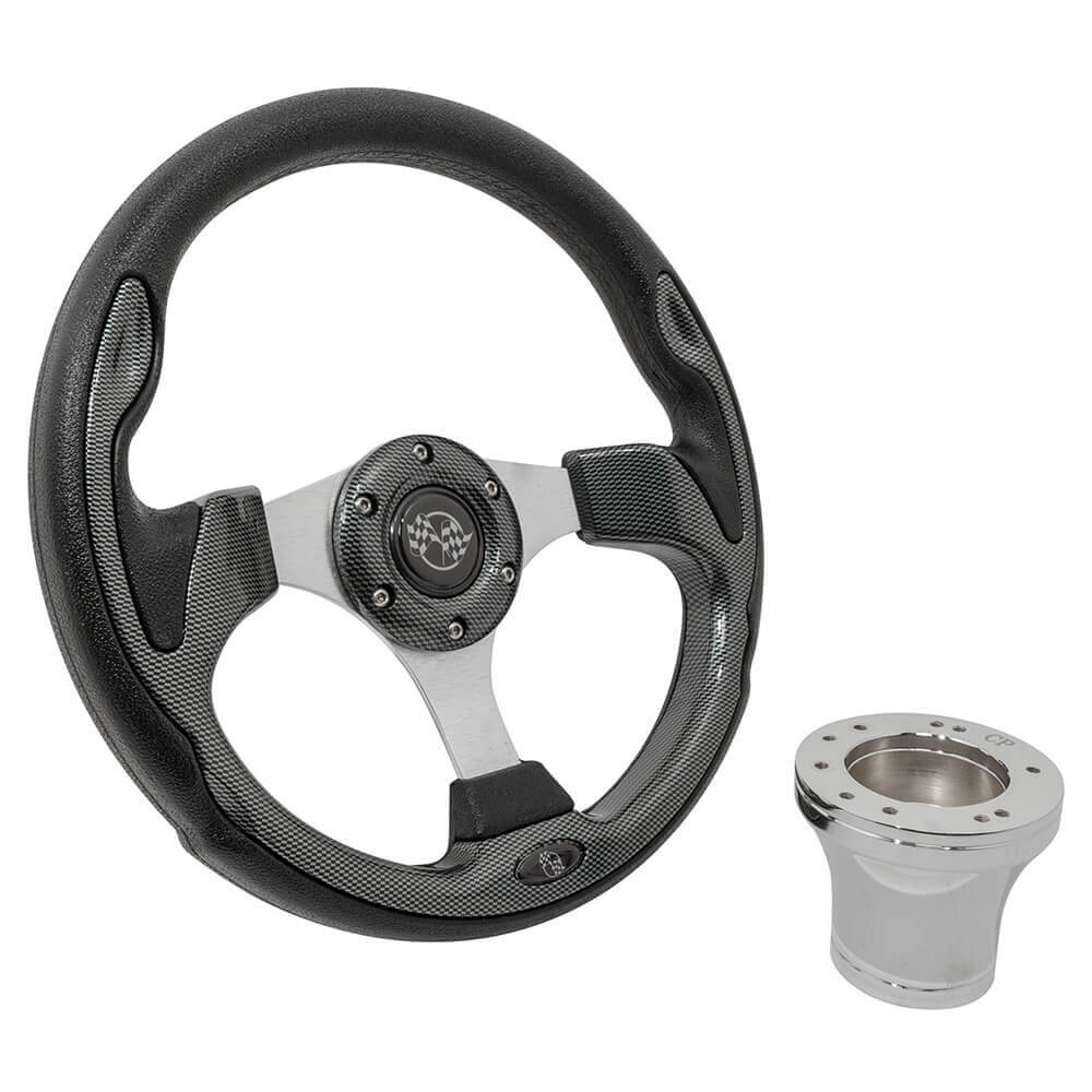 If there is one thing that will make your vehicle look OEM, it is the stock steering wheel. Even after throwing upgrades like aftermarket rear seats and seat covers, the whole cart will retain the factory aura if left unchecked. Pick up a Buggies Unlimited Club Car DS Carbon Fiber Steering Wheel and Adapter kit, and make sure your golf cart is anything but what comes down the line.This kit comes with a 12.5-inch rally-style carbon-fiber steering wheel and chrome adapter kit to make everything look polished. It will fit Club Car DS gas and electric models 1982-up. The only model excluded is the Precedent. There is nothing OEM about this unit. It is designed with a carbon-fiber inlay and a textured black outer grip for a performance feel, but a brushed silver three-spoke center says we come from the old-school. The chrome adapter and installation hardware come with the kit. Just don't expect to hook up your horn to the pushable centerpiece; the horn button is decorative and nonfunctional. Book one with Buggies Unlimited now!