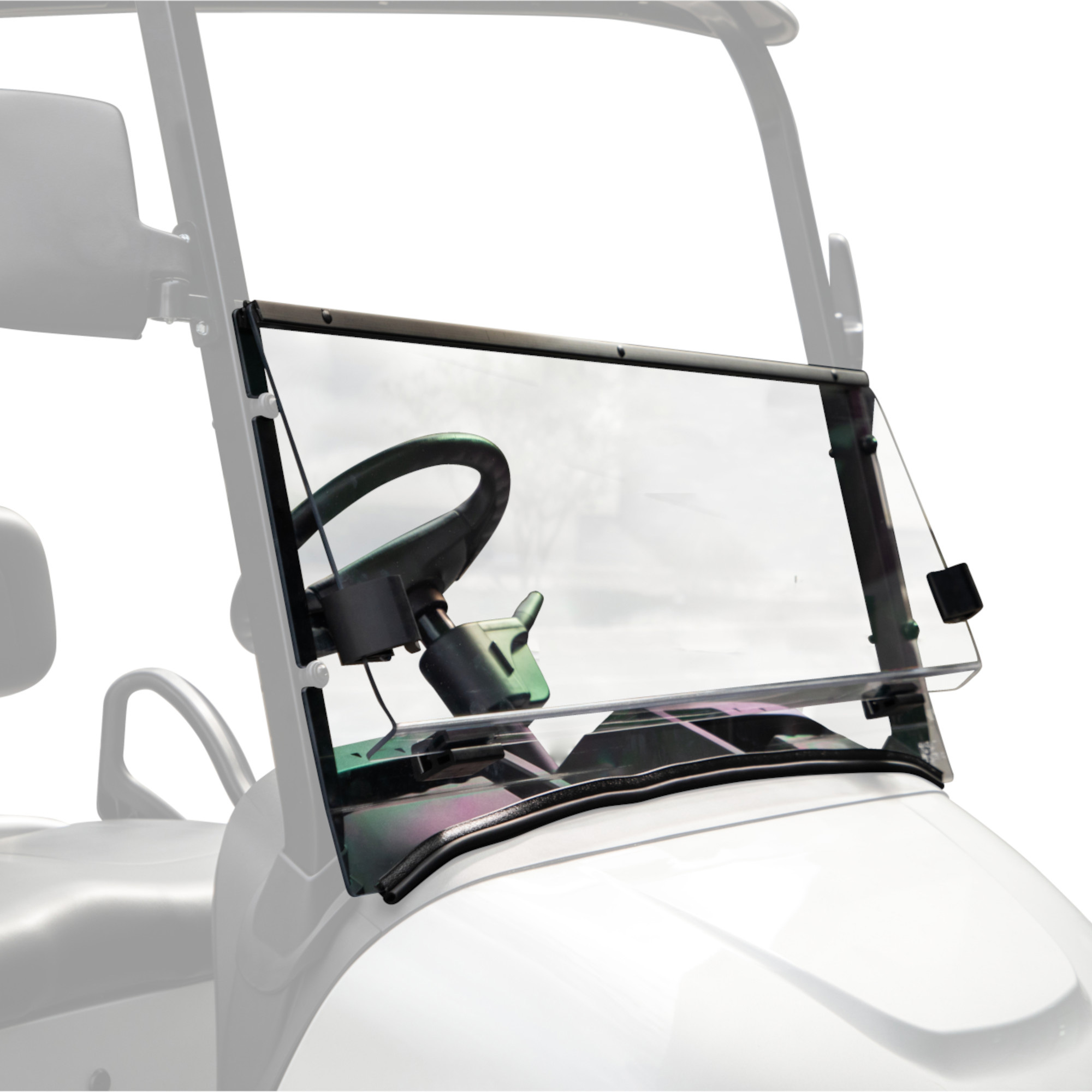 Experience comfort and protection on every ride with this folding windshield. Made from high-quality, abrasion-resistant polycarbonate, it provides clear visibility while shielding you from rocks, sticks, golf balls, and other debris. Lightweight and easy to install, the setup includes everything you need for a quick and hassle-free installation. The folding design lets you adjust the windshield, allowing you to fold it down for a breeze or keep it up for full coverage.
