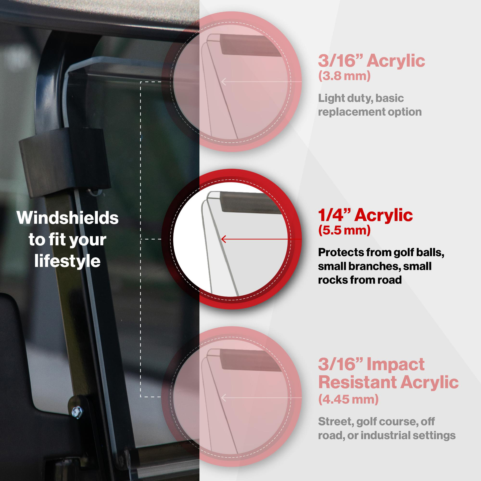 - Clear Acrylic: 1/4” acrylic provides excellent visibility for a safe drive.
