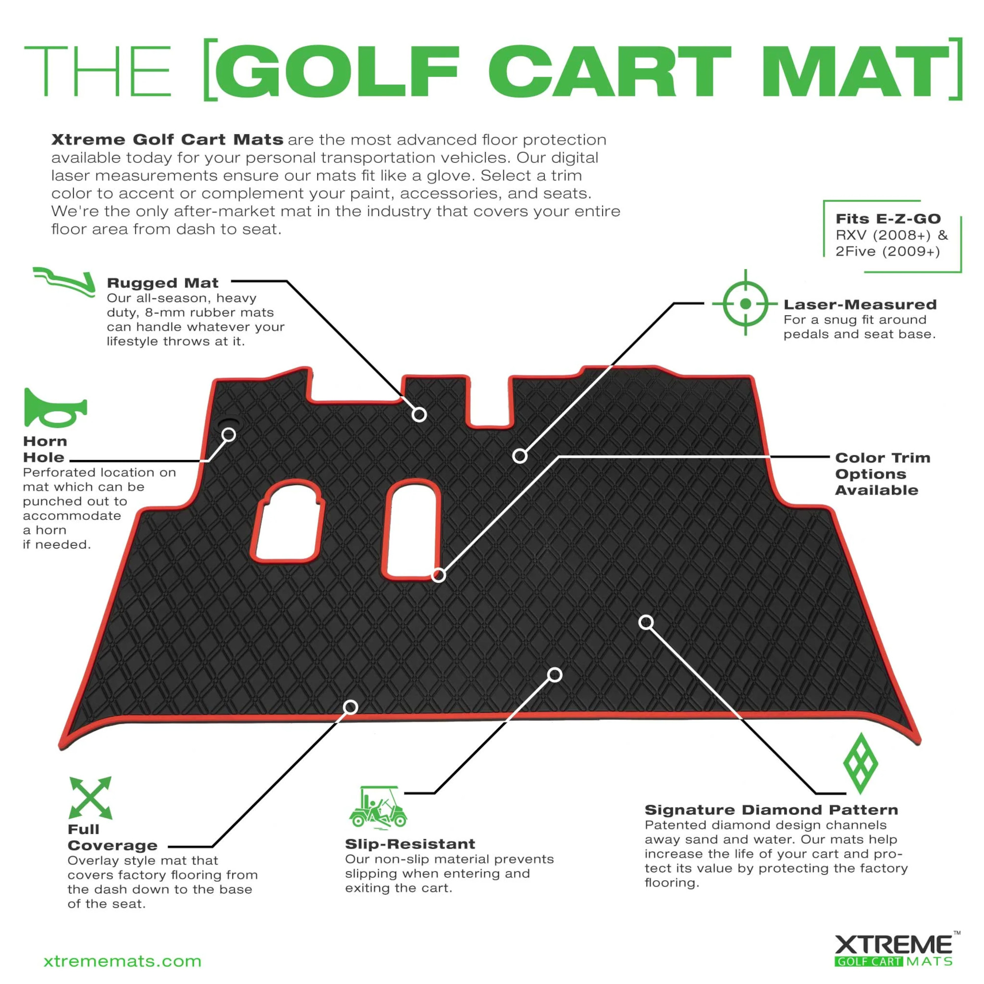 Xtreme Mats has created a full coverage golf car floor mat that is laser-measured to fit as if it came directly from the manufacturer. This heavy-duty, 8-mm rubber golf cart floor mat remains securely in place even during rugged terrain navigation. The mats produce no VOCs so you won't have to worry about it stinking up your garage either! Their patented design picks up where the other guys left off. Unlike other golf cart floor mats that offer only partial coverage, Xtreme Mats won't limit where riders can place their feet and you won't end up with a pile of dirt behind your floor mat. Xtreme Mats Golf Cart Floor Mat covers your entire OEM flooring from the bottom of the dash down to the base of the seat. No longer worry about mud, water, or dirt damaging your cart's flooring! Xtreme Golf Cart Mats are available in a variety of colors to complement almost any aesthetic.